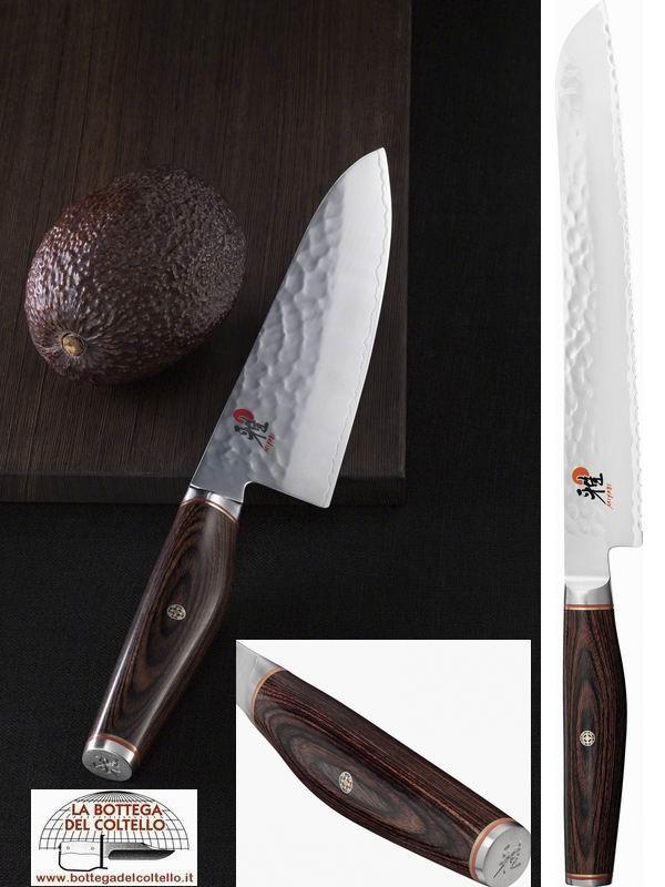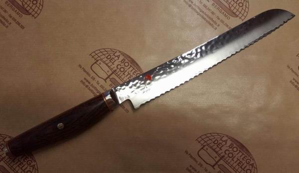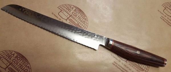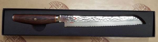 34076-231 Bread knife - The ultra-hard core of the blades of these knives is surrounded by two further layers of steel. The special hardening process and the original Japanese craftsmanlike grinding also give these blades tremendous sharpness. The blades are given a hammered finish in production, providing them with a visually attractive finish but also ensuring that food does not stick on when cut. The crowned handle made of durable, easy-care palisander pakka wood is pleasant and safe to hold. The superlative radiance of the natural material is underlined by a mosaic pin in the middle of the handle and the decorative steel end cap. The harmony of aesthetics and functionality fuses perfectly in this range of knives. Packaging: plastic box.
