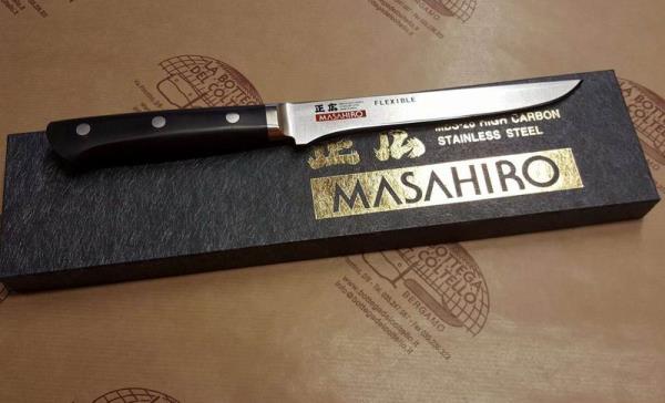 Boning knife Masahiro 14972 with a flexible stainless steel blade that becomes incredibly hard with HRC 58 to 59.