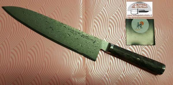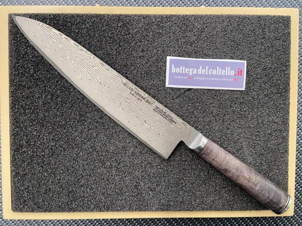Beautiful workmanship "flower damask" 132 layers. Core blade made of MicroCarbide MC66. CRYODUR® blade treated at -196 ° to obtain an exceptional hardness, about 66 HRC. "D handle", also known as chestnut handle, made of "Black Ash", which offers an elegant contrast with the blade. Item 34401-241. Blade lenght: 24 cm. Hand wash only! Packaging: elegant black box.