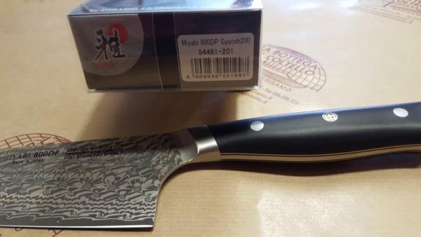 Zwilling Japan item 54481-201 Gyutoh200 Chef knife. 49-layers San Mai blade. Fine carbide cutting center = FC61. Hibana - damask flower. Brass spacers. Central mosaic pin. Blade length 20 cm. Packaging: plastic and cardboard box.