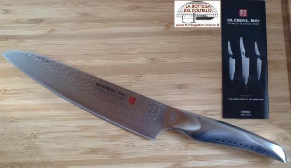 GLOBAL SAI KNIVES HAVE BEEN DESIGNED BY KOMIN YAMADA, CALLING UPON HIS 25 YEARS OF EXPERIENCE AND KNOW-HOW. THE HANDLE DESIGN IS ENTIRELY NEW AND INCORPORATES AN ERGONOMIC THUMB-REST TO EASE THE CUTTING MOTION.