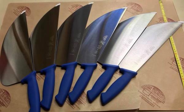 Art. CP.00.PE31 Acciaio X50CrMoV15 Extra quality Steel. Satin finish blade. Blade length 310 mm, maximum width 105 mm. Protected blue synthetic handle. Packing: Transparent plastic bag.