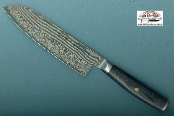 Santoku is indicated for cutting and chopping meat, fish and vegetables. Item: 34684-181. Blade length: 18 cm. Damask design with 49 layers, steel FC61, pakkawood handle. Packaging: plastic box.