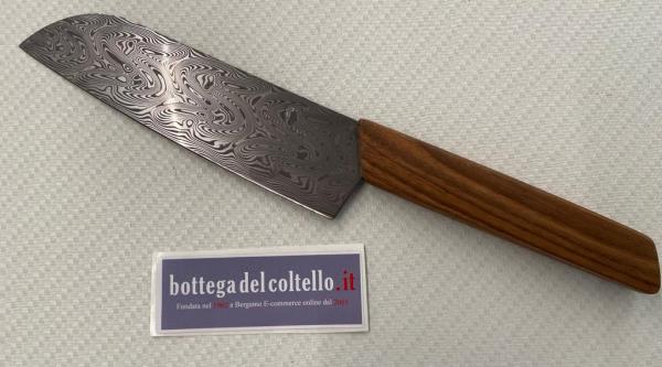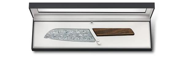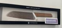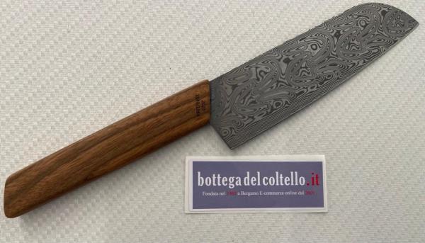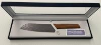 Swiss Modern Damast Santoku Knife limited edition 2020, only 1884 pieces numbered. Stainless steel damascus blade by Damasteel, european walnut wood handle