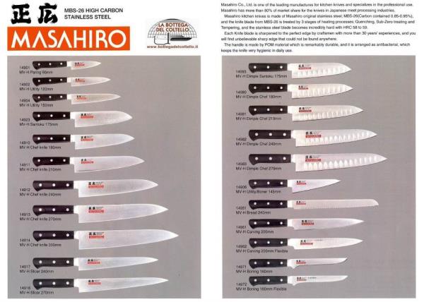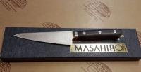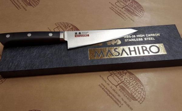 Masahiro 14906 MV-H Utility/Boner knife with a 145 mm blade length. Masahiro kitchen knives are made of Masahiro original stainless steel: MBS-26 (carbon contained 0.85-0.95%), and the knife blade from MBS-26 is treated by 3 stages of heating processes: quenching, sub-zero treating and tempering, and the stainless steel becomes incredibly hard with HRC 58 to 59. Each knife blade is sharpened to the perfect edge by craftsmen with more than 30 years' experiences, and you will find unbelievable sharp edge that could not be found anywhere. The handle is made by POM material which is remarkably durable, and its arranged as antibacterial, which keeps the knife very hygienic in daily use. Packaging: cardboard box.