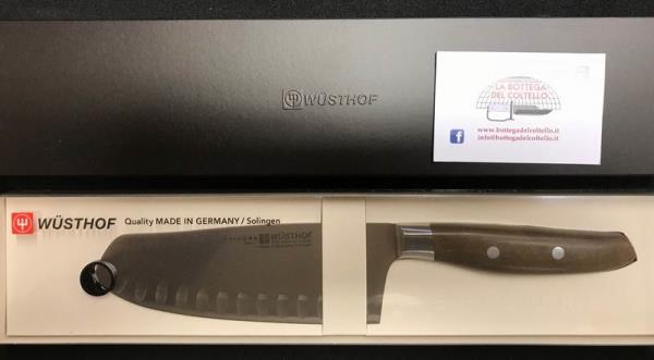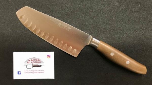 Wusthof Quality Made in Germany / Solingen - Epicure series - Art. 3983/17 cm blade length Santoku knife. Its strengths are in chopping and cutting fish, meats, and vegetables. The alveolated blade reduces friction with foods. Improved balance. Optimized handle and blade shaping. Forged from one piece of X50CrMoV15 blade steel. High-precision laser-controlled sharpening. Grip made of sustainable natural fiber material. Design: Bjoern Berger. Packaging: cardboard box.