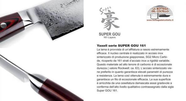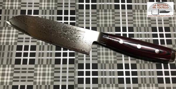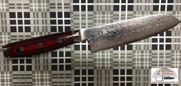 Yaxell Santoku, Super Gou 161 series, is a typical Japanese knife. Damascus blade, canvas-micarta handle. Made in Japan.