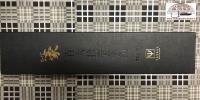 Art. 37101 Super Gou 161 layers Damascus Santoku Chef's knife, 165mm blade length. The blade has an extremely sharp cutting edge. It is made out of Japanese SG2 MicroCarbide powder stainless steel, which is enveloped by 160 layers with soft and hard stainless steel. This powdered steel contains a lot of carbon and has an unprecedented hardness of approximately 63 Rockwell. Powered steel is used because it ensures a high degree of purity and strength. The resulting blade is extremely hard, ensuring an exceptionally sharp cutting edge. The surface impresses with a fascinating Damascus design pattern - a symbol of the highest quality knife and its signature, Super GOU 161. The handle is made out of FDA-approved red-black Canvas-Micarta, which is an enormously durable material made of resin and linen. The canvas material is dyed red and black and brilliantly finished. This material lasts decades. The handle is attached tightly using three stainless steel rivets. The end of the handle is made of 18-10 stainless steel, which gives the knife outstanding stability and balance. The trade mark is engraved on the grip end in a noble style. The black cardboard box is also elegant.