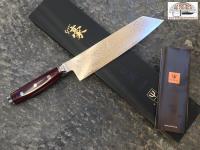 Art. 37134 Super Gou 161 layers Damascus Chef's knife, 200mm blade length. The blade has an extremely sharp cutting edge. It is made out of Japanese SG2 MicroCarbide powder stainless steel, which is enveloped by 160 layers with soft and hard stainless steel. This powdered steel contains a lot of carbon and has an unprecedented hardness of approximately 63 Rockwell. Powered steel is used because it ensures a high degree of purity and strength. The resulting blade is extremely hard, ensuring an exceptionally sharp cutting edge. The surface impresses with a fascinating Damascus design pattern - a symbol of the highest quality knife and its signature, Super GOU 161. The handle is made out of FDA-approved red-black Canvas-Micarta, which is an enormously durable material made of resin and linen. The canvas material is dyed red and black and brilliantly finished. This material lasts decades. The handle is attached tightly using three stainless steel rivets. The end of the handle is made of 18-10 stainless steel, which gives the knife outstanding stability and balance. The trade mark is engraved on the grip end in a noble style. The black cardboard box is also elegant.