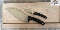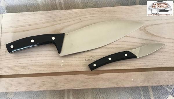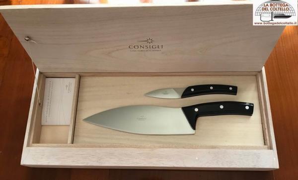One very large knife and one very small, that together can do a great deal in the kitchen, in fact practically everything. This is the concept behind the collaboration between the Consigli family and Franco Milani, a Scarperia knife designer, and Michele Bosco, chef in the ancient Medici castle of Cafaggiolo, that has given to the "all for one, one for all" project. Artless wood box.