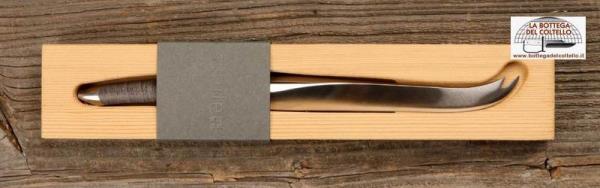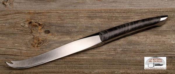 Item S-102E Cheese knife. Handle made of stabilized black colored ash. Total length 230 mm, blade 130 mm. Packaging: cardboard box. Shades and natural streaks may be different from that reproduced on the image.