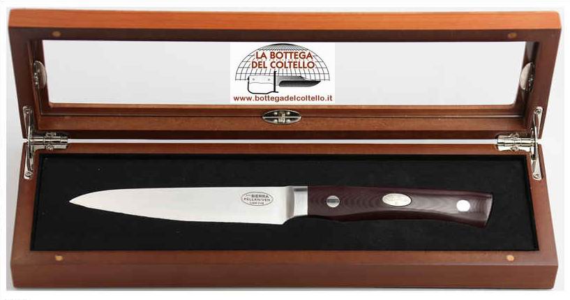 CMT stands for Character, Morse and Telephone. Those who appreciate high quality handmade knives in general should find that this is a series especially made for them. Qualities like high grade steel, handle material, overall design and way of manufacturing will tell the purchaser that these kitchen knives are made with the same care as Fallkniven's best fixed blade hunting & outdoor knives. With normal care, these knives will serve through your whole life. Every knife is delivered in a solid wood gift box. Mod. Sierra Total length (mm) 225 Blade length (mm) 115 Blade thickness (mm) 2 Blade profile Convex Tang Full tang construction Weight (knife) 110g Steel Lam.CoS Hardness 60 HRC Handle material Maroon micarta.