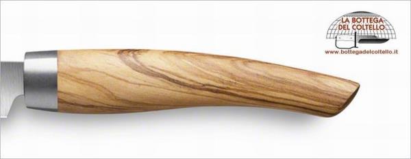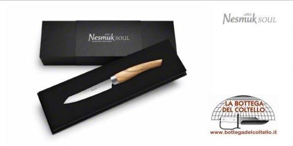 Paring knife. Blade length mm 90, thickness mm 1,5. Olive wood handle. The natural striations of the handle may be different from that reproduced on the image. Each Nesmuk SOUL knife is shipped in a high-quality, matte box.
