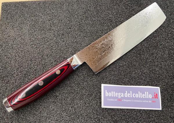 Yaxell Super Gou 161, Nakiri is a typical Japanese knife. Damascus blade, canvas-micarta handle. Made in Japan.