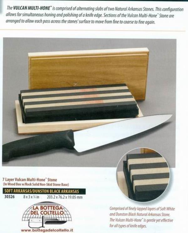 Comprised of finely lapped layers of Soft White and Dunston Black Natural Arkansas Stone. The Vulcan multi-hone is gentle yet effective for all types of knife edges. Dimensions: 203.2x76.2x19.05 mm.