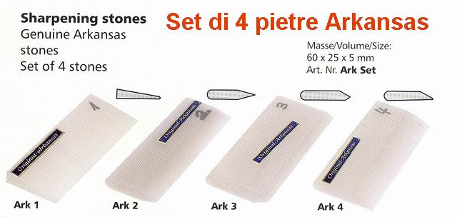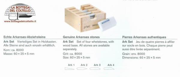 Ark Set 4 whetstones wood base - Set of four whetstones, with wood base. All stones are available separately. Dimensions each stone approximately: 60 x 25 x 5 mm.