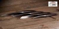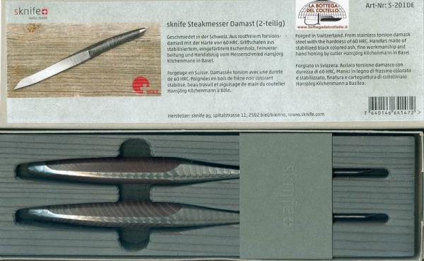 Item S-201DE Two steak knives forged in Switzerland from stainless torsion damask steel 60 HRC. Handles made of stabilized black colored ash, fine workmanship and hand honing by cutler Hansjorg Kilchenmann in Basel. Total length 230 mm, blade 130 mm. Packaging: cardboard box. Shades and natural streaks may be different from that reproduced on the image.