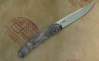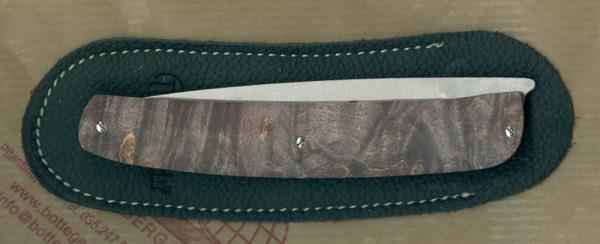 Cod. 380/RN Steak folding knife with a liner lock mechanism. Description published by the producer: Handle: black colored Burl - Blade: W.4116 Hrc 57 Stainless steel (100 mm) - Overall length: 220 mm - Weight: 90 gr - Sheath: Eco leather. Package: black cardboard box. The handle can have shades and natural streaks different from that reproduced on the image.