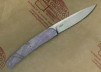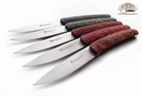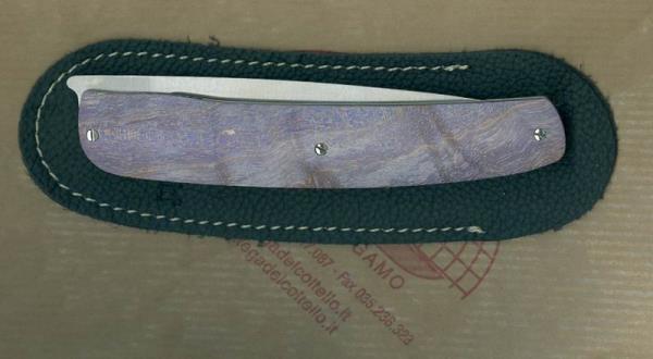 Cod. 380/RB Steak folding knife with a liner lock mechanism. Description published by the producer: Handle: blue colored Burl - Blade: W.4116 Hrc 57 Stainless steel (100 mm) - Overall length: 220 mm - Weight: 90 gr - Sheath: Eco leather. Package: black cardboard box. The handle can have shades and natural streaks different from that reproduced on the image.