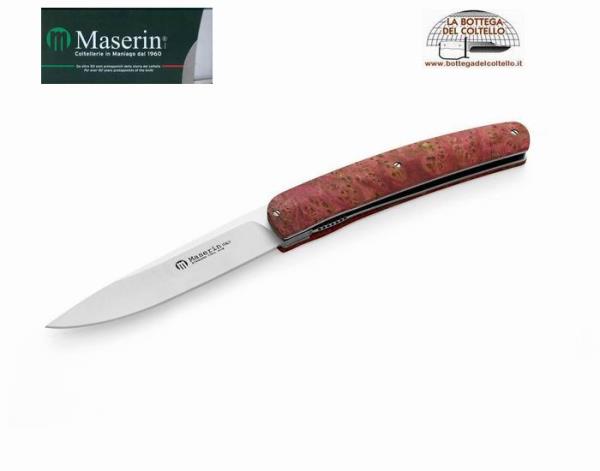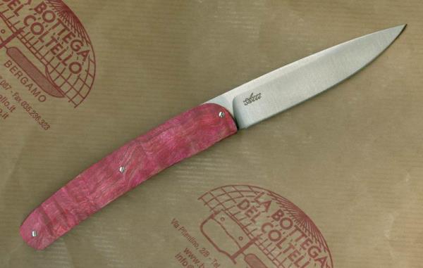 Cod. 380/RS Steak folding knife with a liner lock mechanism. Description published by the producer: Handle: pink colored Burl - Blade: W.4116 Hrc 57 Stainless steel (100 mm) - Overall length: 220 mm - Weight: 90 gr - Sheath: Eco leather. Package: black cardboard box. The handle can have shades and natural streaks different from that reproduced on the image.