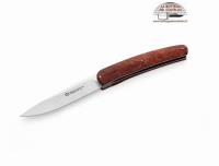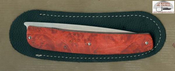 Cod. 380/RR Steak folding knife with a liner lock mechanism. Description published by the producer: Handle: Red colored Burl - Blade: W.4116 Hrc 57 Stainless steel (100 mm) - Overall length: 220 mm - Weight: 90 gr - Sheath: Eco leather. Package: black cardboard box. The handle can have shades and natural streaks different from that reproduced on the image.