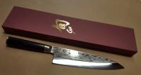 VG-10 super stainless steel; single beveled edge for less sticking and less damage for food; black Pakkawood handle; handle's "Chestnut" shape design with offset bolster fits the hand perfectly; stainless steel bolsters and caps. For right hand use.