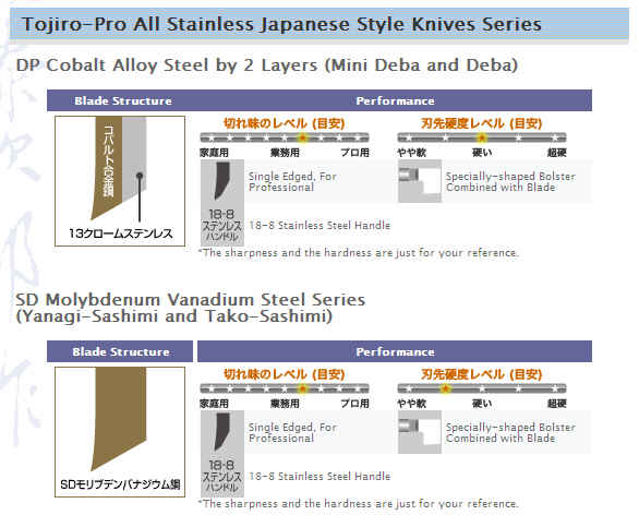DP COBALT ALLOY STEEL BY 2 LAYERS. 18/8 stainless steel asymmetric handle. Blade thickness mm 4. For right hand use.less than brgreater than Packaging: elegant blue cardboard box.