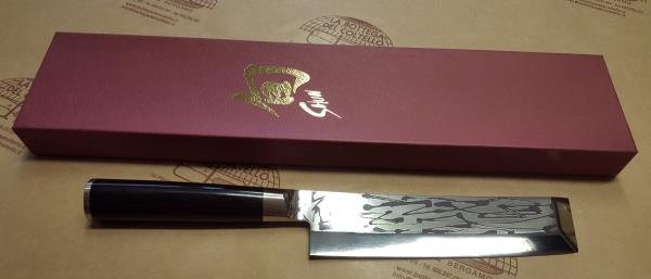 THE EXCLUSIVE QUALITY AND UNIQUE LOOK OF THE SERIES ARE OUTSTANDING CHARACTERISTICS OF THE LONG TRADITION OF THE KAI PRODUCTS AND MAKE EVERY SINGLE KNIFE A SPECIAL PIECE. Thanks to its form, the dark Pakkawood of the Shun Pro Series is a true hand charmer. The blade of AUS10A steel receives and ornamental tooling from an innovative etching technology. Sanded on one side, the extraordinarly sharp knives run trough the cutting good smoothly and precise, and fully meet the requirements of a professional cutting tool. For right hand use.