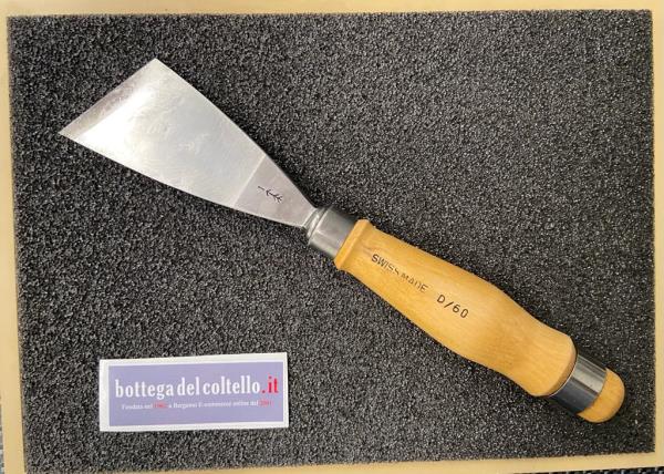 Dräyer gouge D/60mm made in Switzerland by Pfeil. This gouge is used for rough cutting. The slightly skewed edge makes cutting easier and produces clean shavings. Double bevel cuts to the right or left. Weight gr 350 - Length mm 295 - Blade width mm 60.