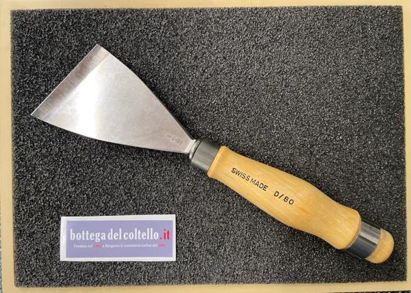 Dräyer gouge D/80mm made in Switzerland by Pfeil. This gouge is used for rough cutting. The slightly skewed edge makes cutting easier and produces clean shavings. Double bevel cuts to the right or left. Weight gr 430 - Length mm 295 - Blade width mm 80.