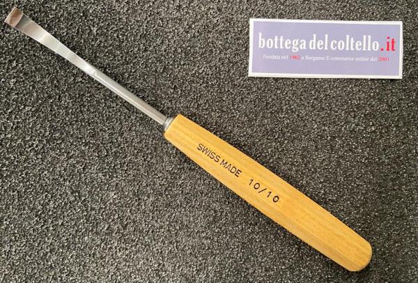 Reverse bent gouge 10/10mm for carving hard-to-reach convex surfaces and for neat finish work. Swiss made.