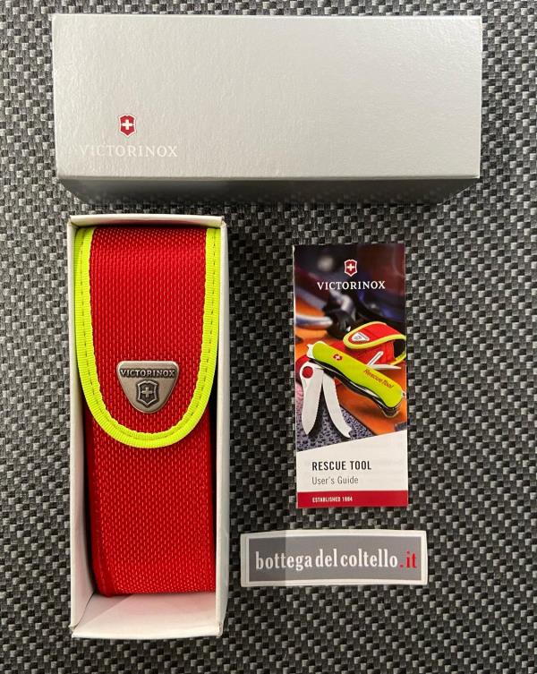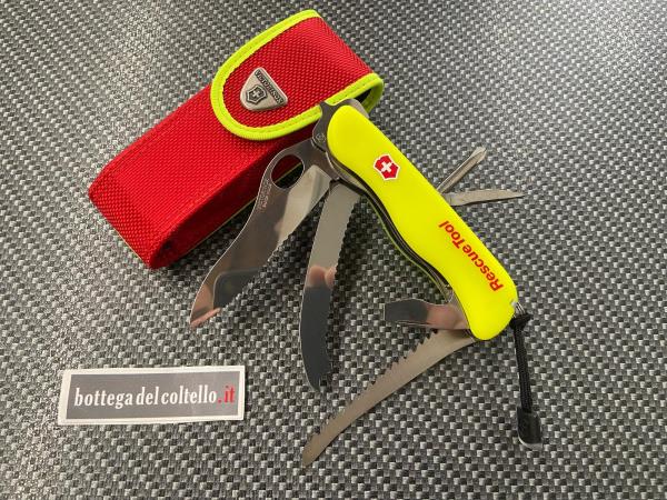 Rescue fluorescente utensile multifunzione di Victorinox è indispensabile per la sicurezza e il soccorso nelle situazioni d'emergenza. Ha lama grande bloccabile, cacciavite Phillips, frangi vetro, cacciavite - apri-cassa - levacapsule - spelafili, alesatore, punzone, taglia cinture di sicurezza, anello, pinzetta, stuzzicadenti, sega a disco per vetro infrangibile, impugnatura luminescente, cordino e contenitore in nylon.