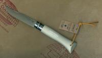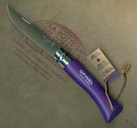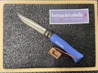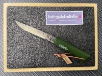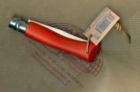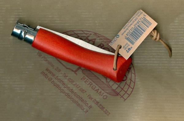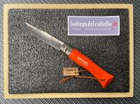 Opinel 07 color arancio: lunghezza totale mm 175; lama in acciaio inossidabile mm 75; chiuso mm 100; sistema Virobloc blocca-lama in apertura e in chiusura; impugnatura in legno di faggio colorato; stringa in cuoio.