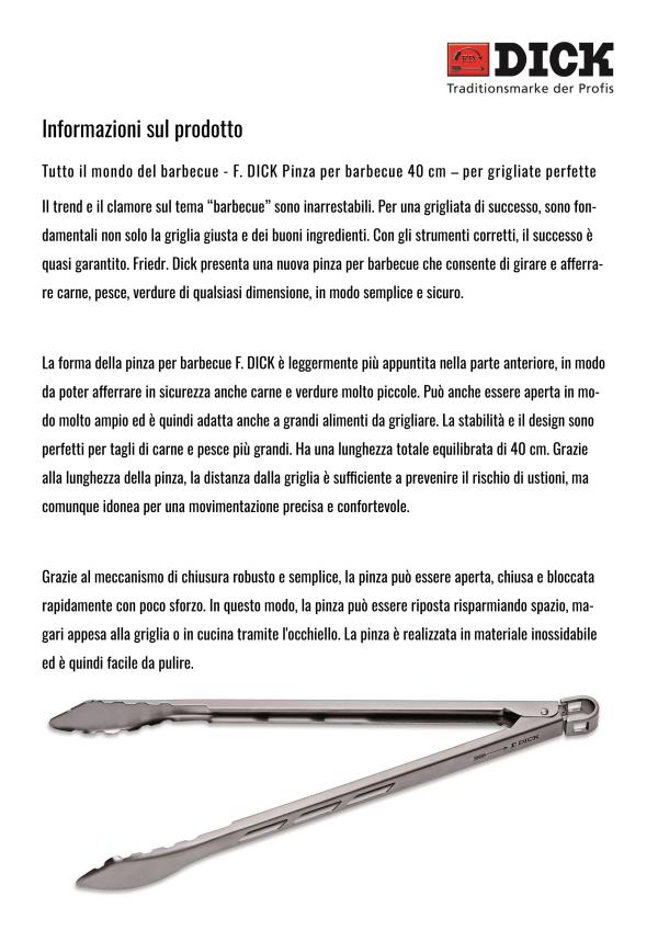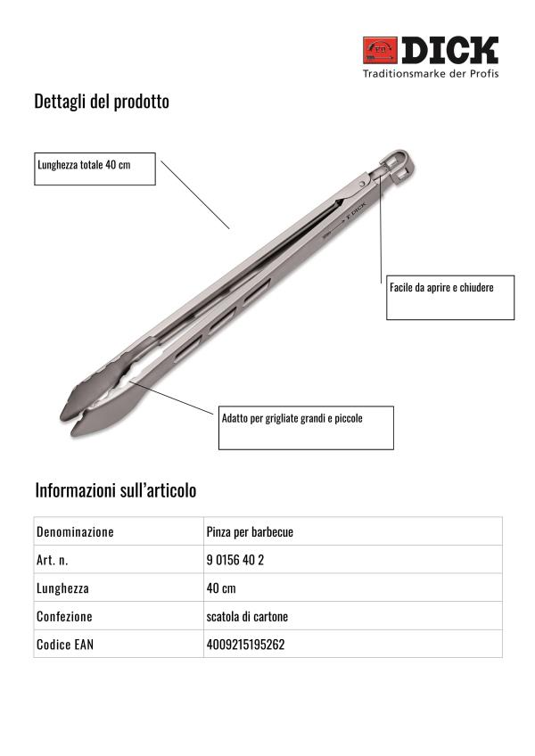 Caratteristiche del prodotto: facile da aprire e chiudere, adatto per pinzare pezzi grandi e piccoli, lunghezza totale cm.40 realizzata in acciaio inossidabile, distribuita in scatoletta di cartoncino da F.Dick