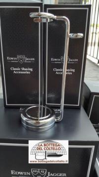 Art. DWSRB Questo elegante stand è uno strumento bello e pratico per conservare e far asciugare il pennello e il rasoio da barba. E' fatto a mano a Sheffield, in Inghilterra, utilizzando una combinazione di tecnologie all'avanguardia e abilità artigianali. Modellato in ottone massiccio con finitura cromata di ottima qualità, ha la base marchiata con il logo Edwin Jagger. Dimensioni: diametro base 45 mm, altezza totale 125 mm, diametro anello porta rasoio 13 mm, apertura anello porta rasoio 11 mm, diametro anello porta pennello 27,5mm, apertura anello porta pennello 26 mm. Compatibile con tutte le serie premium di Edwin Jagger, tra cui Chatsworth, Riva, Bulbous, Plaza e Loxley. Non adatto per rasoi DE89 e per rasoi o pennelli in stile georgiano. Imballaggio: scatola di cartone con il solo stand.