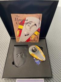 La decorazione di questi preziosi taglia-sigari è stata realizzata manualmente con l'arte del decoupage. Abili artigiani hanno individuato, ritagliato e collocato ogni singola parte della decorazione, fissando poi il risultato ottenuto con più strati di vernice trasparente. Ogni tagliasigari è contenuto in un'elegante scatola nera in pelle.