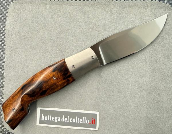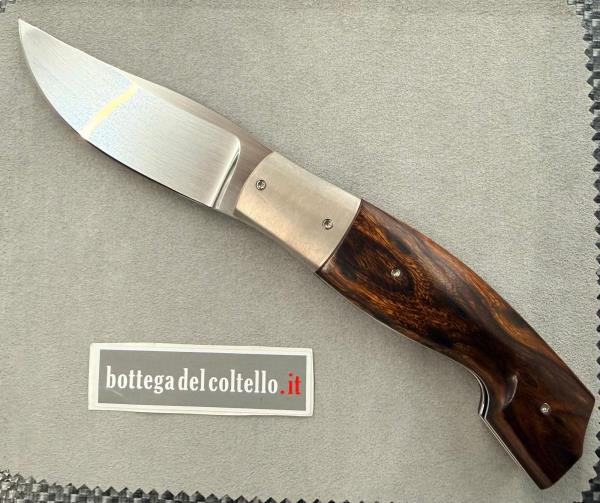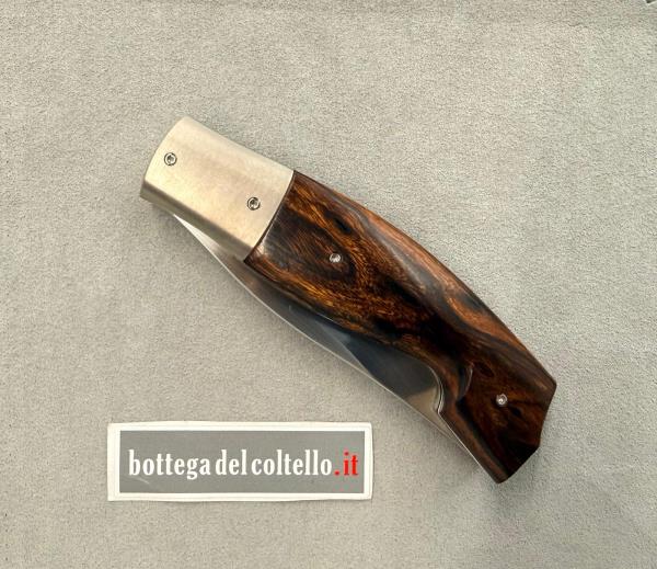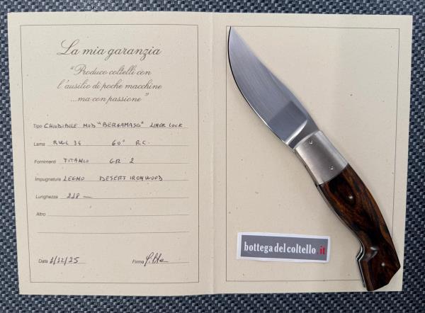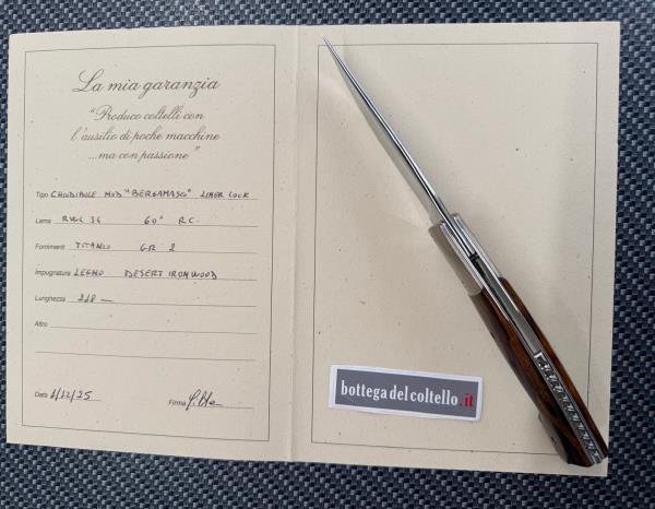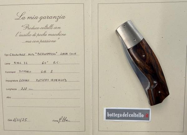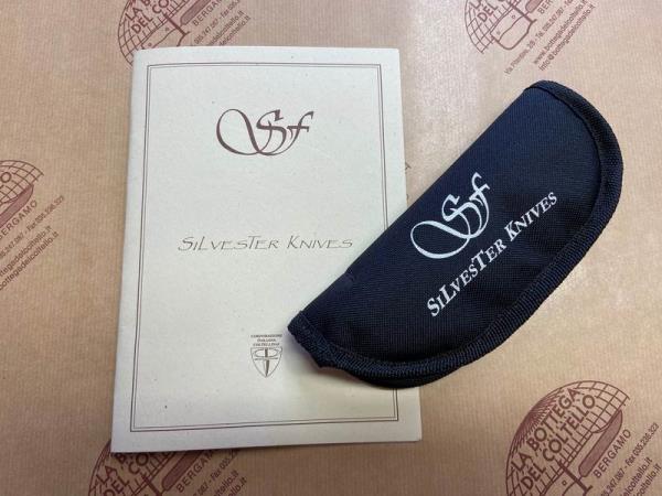 Silvester è il nome d'arte di Fabrizio Silvestrelli, coltellinaio italiano residente a Lecco, che dice di sè: "Produco coltelli con l'ausilio di poche macchine ...ma con passione". Questo liner lock da lui realizzato è una versione preziosa del tipico coltello da pastore delle valli bergamasche. La lama è in acciaio inossidabile RWL 34 - 60 HRC, l'impugnatura è in desert ironwood, i fornimenti in titanio GR.2. Lunghezza totale, aperto, mm 248, chiuso mm.120 lama 90-95 mm. Custodia con cerniera in materiale sintetico nero.