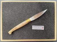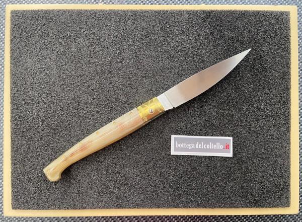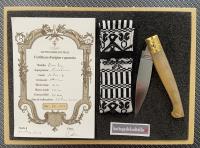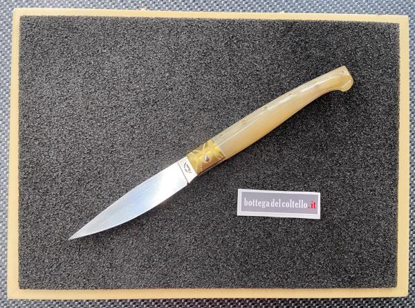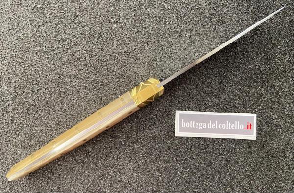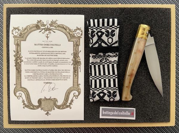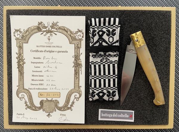 Il maestro della Corporazione Sarda Coltellinai, Dore Matteo ha realizzato artigianalmente questa resolza, con manico il corno di montone, lama in acciaio Nitro B con durezza Hrc 59 e fornimenti in ottone. Misure del coltello: lunghezza totale aperto mm.267 lama mm.118 manico mm 149 Numero 34 della produzione 2025.