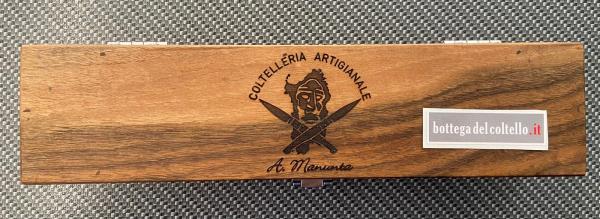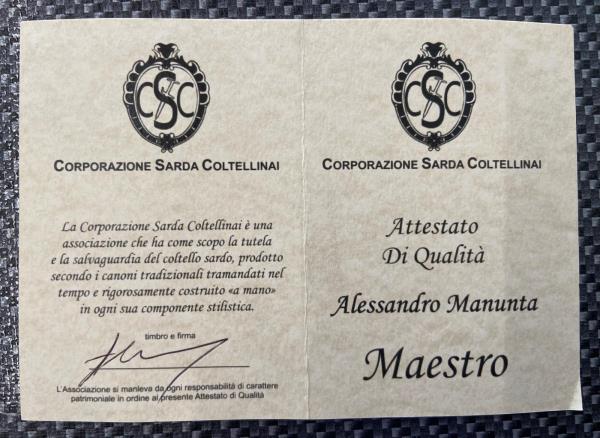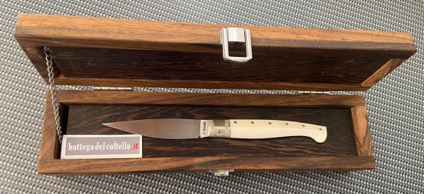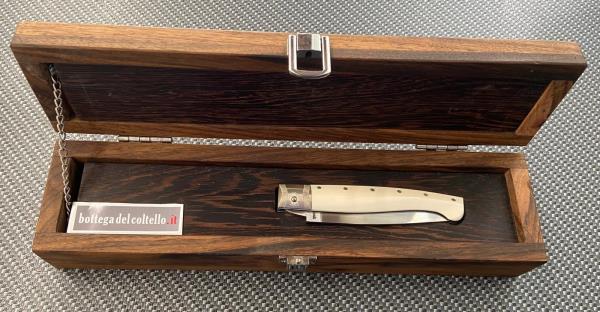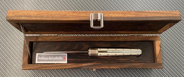 Coltello a serramanico stile Pattada, lama in acciaio inox e manico in avorio di Mammut, realizzata artigianalmente da Manunta Alessandro, membro della Corporazionezione Sarda Coltellinai. Lunghezza totale mm. 227 lama mm.100, lama in acciaio inox 14C28N durezza Hrc 61 manico in avorio fossile di Mammut, collare in Argentium, decorato con " Piccadura "