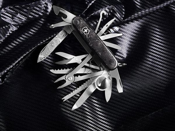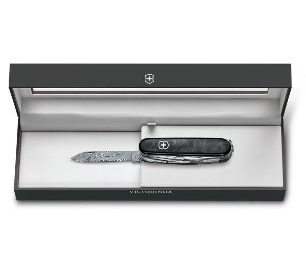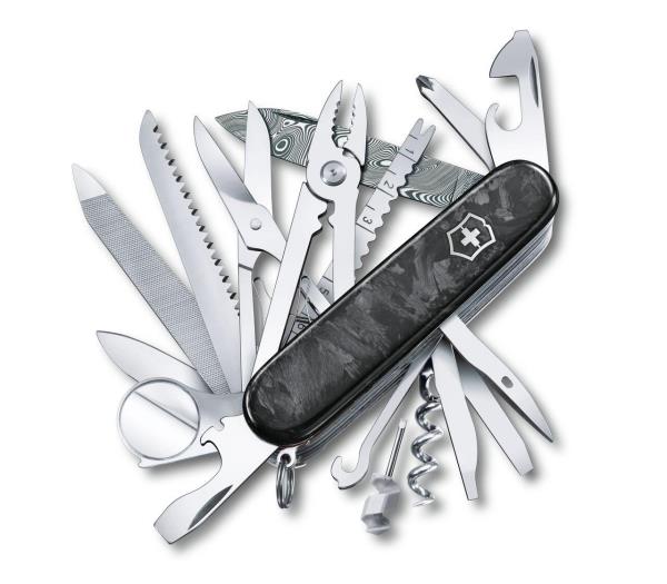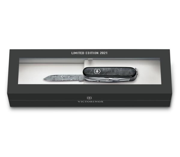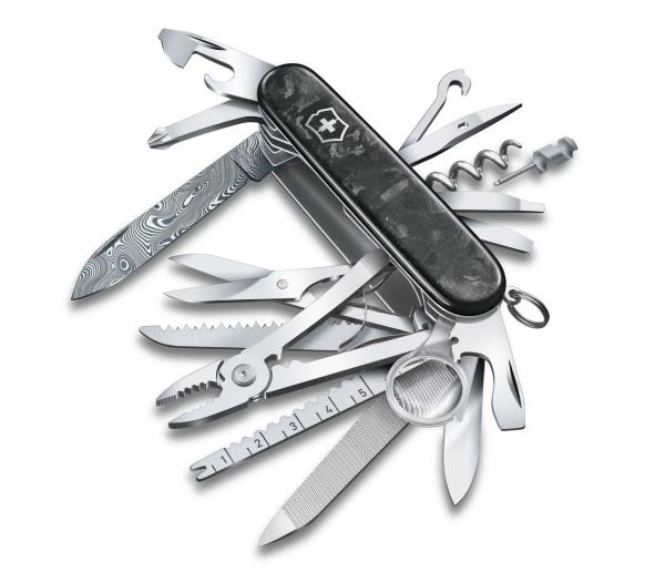 Edizione limitata dello Swiss champ di Victorinox per il 2021, lama in damasco "Bjorkmans Twist" e guancette in fibra di carboonio effetto marmorizzato.