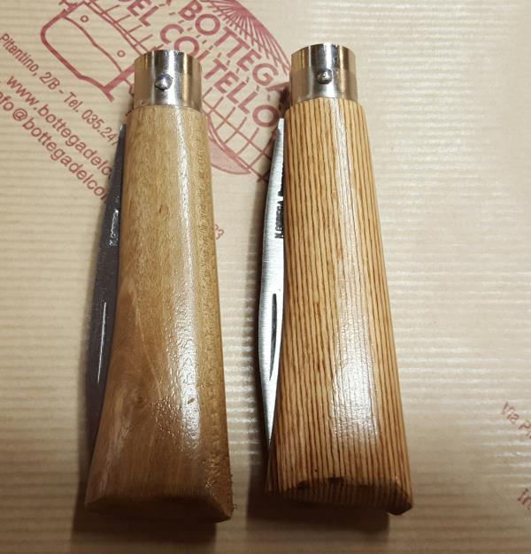Il coltello è prodotto con impugnature in legno di faggio, carpino o multistrato di legno: viene venduto con venatura e legno a seconda della disponibilità. Dimensioni: lunghezza totale mm 180, lama mm 80, chiuso mm 100, peso gr 42. Acciaio al carbonio. Senza blocco lama. Le possibili imperfezioni o imprecisioni lavorative, sono comprensibili conseguenze dell'economica elaborazione rustica e tradizionale.