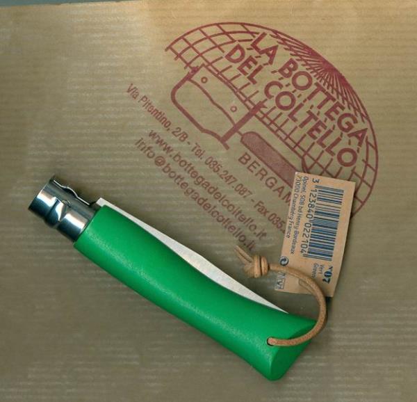 Opinel 07 color verde: lunghezza totale mm 175; lama in acciaio inossidabile mm 75; chiuso mm 100; sistema Virobloc blocca-lama in apertura e in chiusura; impugnatura in legno di faggio colorato; stringa in cuoio.