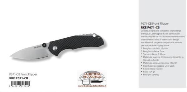 Ruike Art. P671-CB Coltello chiudibile Made in China. Dimensioni: lunghezza totale mm 164, lunghezza lama mm 70, spessore lama mm 3,5, peso gr 104. Materiale manico: G-10 con rivestimento in fibra di carbonio. Materiale lama: acciaio inox 14C28N. Sistema di bloccaggio: Liner Lock. Colore: nero. Confezione: scatola di cartoncino. Il manico dal design ambidestro è progettato ergonomicamente per una perfetta impugnatura.