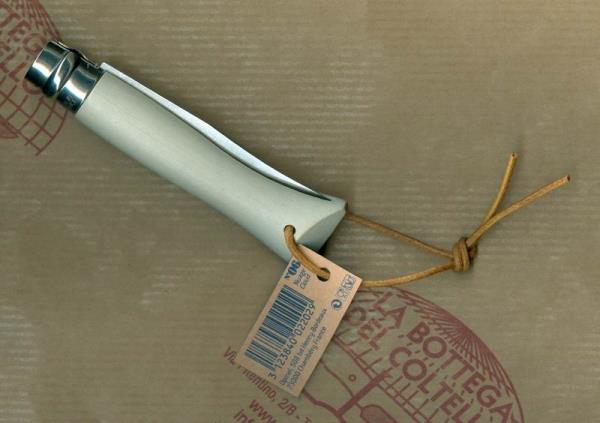 Opinel 06 color nuvola: lunghezza totale mm 165; lama in acciaio inossidabile mm 70; chiuso mm 90; sistema Virobloc blocca-lama in apertura e in chiusura; impugnatura in legno di faggio colorato; stringa in cuoio.