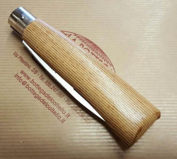 Il coltello è prodotto con impugnature in legno di faggio, carpino o legno stratificato: viene venduto con venatura e legno a seconda della disponibilità. Dimensioni: lunghezza totale mm 225, lama mm 100, chiuso mm 125, peso gr 70. Acciaio non inox al carbonio. Senza blocco lama.