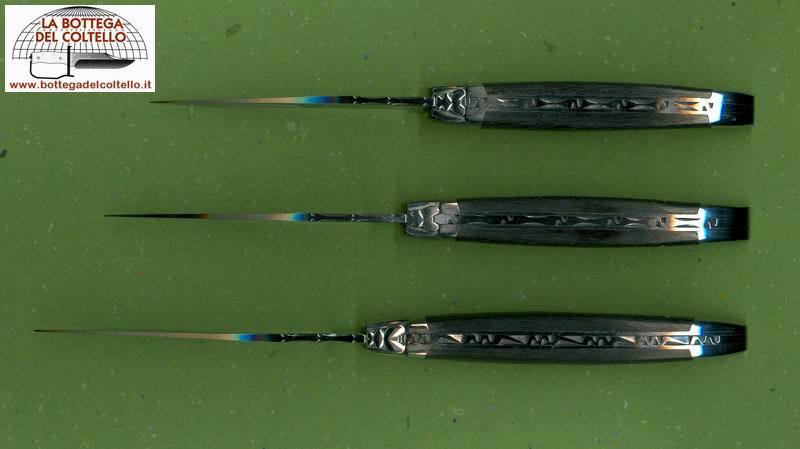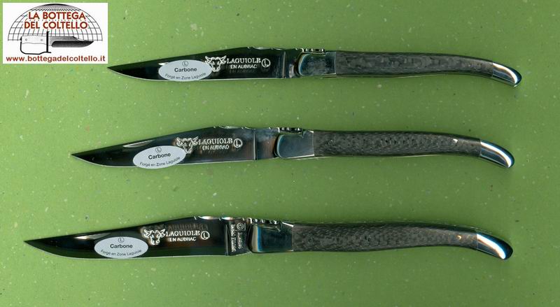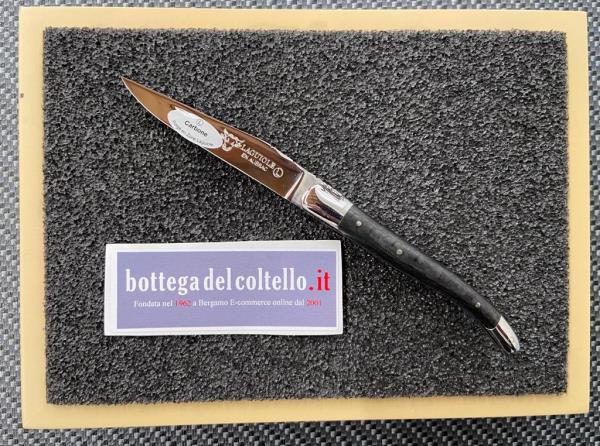 Il coltello Laguiole è nato nel 1829 a Laguiole, piccolo paesino di montagna situato in Aveyron (nel sud ovest della Francia) come modesto coltello da contadino. E' diventato molto famoso grazie all'ape, simbolo di prestigio e di qualità, che adorna la molla. Coltello chiudibile finitura lucida con guancette in fibra di carbonio.