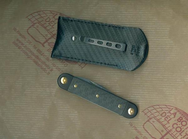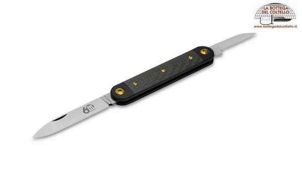 Coltello da tasca Maserin 195/60 Edizione commemorativa con viterie placcate in oro, inserto in fibra di carbonio e mostrine in alluminio anodizzato nero.