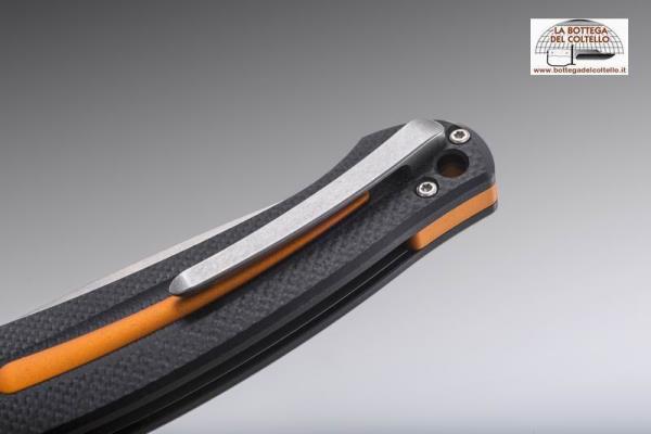 Art. MK FX01-OR Arvenis G-10 inserti arancione - Caratteristiche tecniche fornite dal produttore: Designer: Lucas Burnley - Materiale lama: Bohler M390 microclean - Finitura lama: stonewash - Durezza lama: HRC 58-60 - Spessore lama 4 mm - Lunghezza lama 85 mm - Lunghezza totale (aperto) 203 mm - Peso: 130 gr. - Meccanismo blocco: liner lock in acciaio inox - Sistema apertura: flipper - Meccanismo rotazione: cuscinetti a sfera - Manico: frame in G10 nero lavorato 3D con inserti in alluminio anodizzato arancione - Distanziale: alluminio anodizzato arancione - Clip:acciaio inox ricavata a CNC da solido - Viti: acciaio inox - Ghiera su perno rotazione: aluminio anodizzato arancione. Accessori: astuccio in materiale sintetico con chiusura lampo e passacintura. Confezione: scatola di cartone.