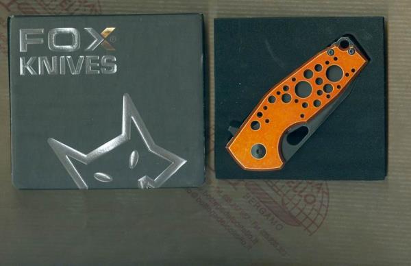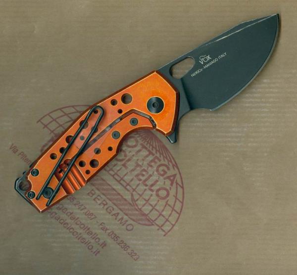 Fox Maniago Suru Coltello Fx-526 Alo. Lama Acciaio Inox N690Co Black Idroglider. HRC 58-60. Manico Alluminio Arancione. Distanziale Alluminio. Wire clip.