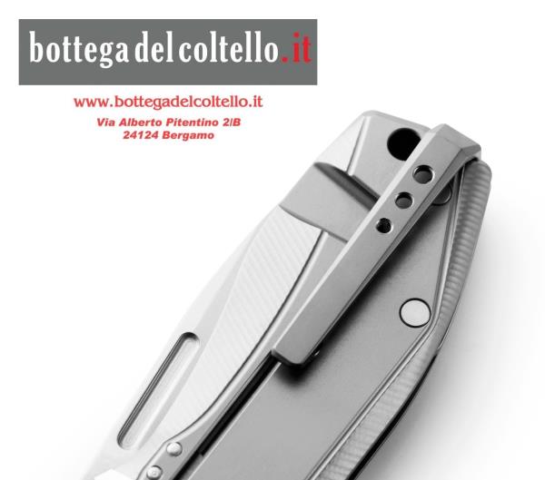La clip, ottenuta fresando a CNC da un pezzo unico di titanio, è reversibile quindi può essere fissata sul lato opposto per gli utenti mancini.